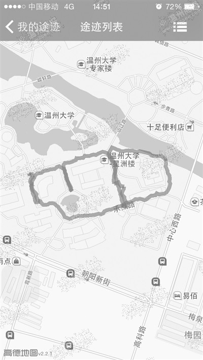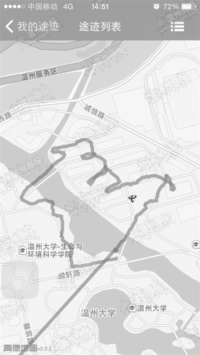 不过,说起来容易做起来难。在实际操作中,跑出成型文字图案并没有罗添添想得那样简单。“有时候跑着跑着,发现前面有幢建筑物挡住了,一条直线就跑不下去了。还有一次,我把‘建’字的‘廴’字旁跑出来了,结果发现‘聿’字跑出来的比例会太小,只好放弃,重新再跑。”在连续奔跑了两个晚上,试验了6次之后,罗添添终于在第7次奔跑时跑出了比较满意的图形。