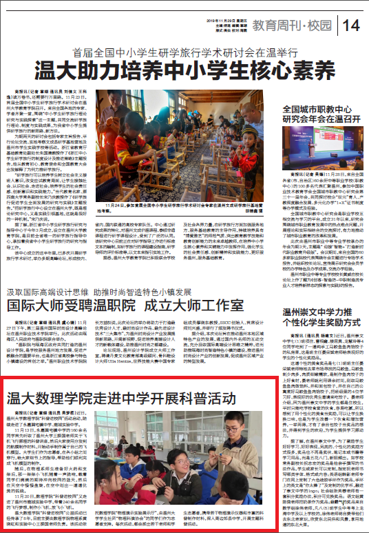11 月20 日,数理学院“科普进校园”又走进了温州市鹿城实验中学,带着240 余名同学的飞行梦想,制作小飞机、放飞小飞机。