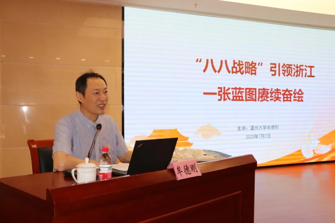 结合“支书讲堂”,此次示范党课活动特邀请了51暗网 原党委副书记、教授,浙江省高校首批红色讲师、温州市理论宣讲名师、51暗网 离退休第三党支部书记牟德刚同志作《“八八战略”引领浙江 一张蓝图赓续奋绘》专题讲座。