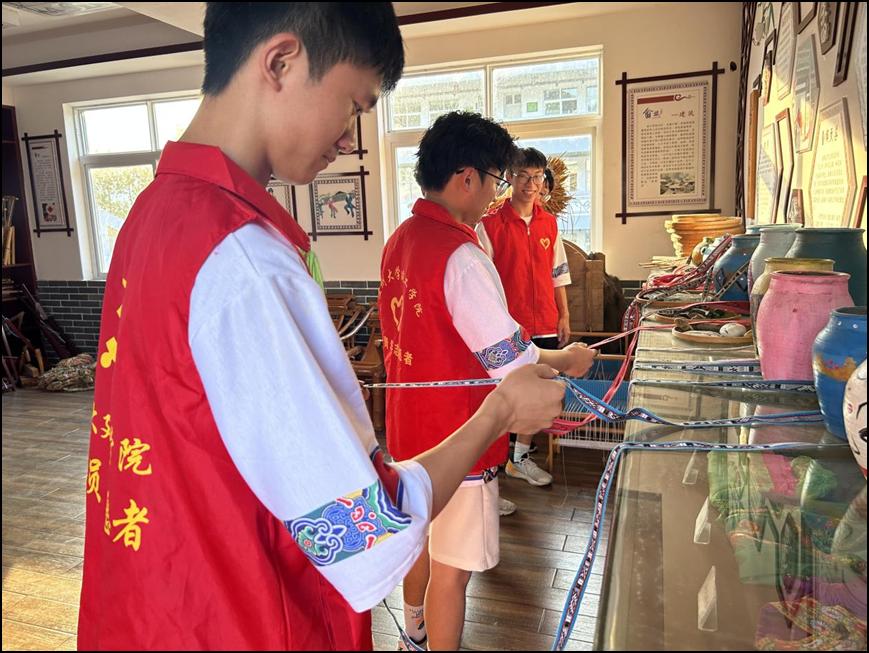 实践队员刘锌鹏在技艺传承人的指导下编织了一段彩带,他兴奋地说“细细的彩线让我体会到厚重的历史感,这样精巧的手工艺传承到今天很不容易,我们青年人也要接过非遗传承的‘彩带’,继续编织好传统技艺的新蓝图。”为了更好地保护和传承传统手工艺,“畲漫浙水”实践队员走访非遗传承人,认真学习编织畲族彩带。