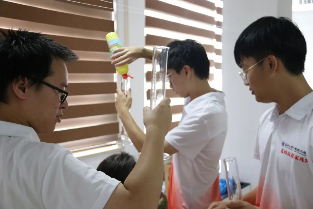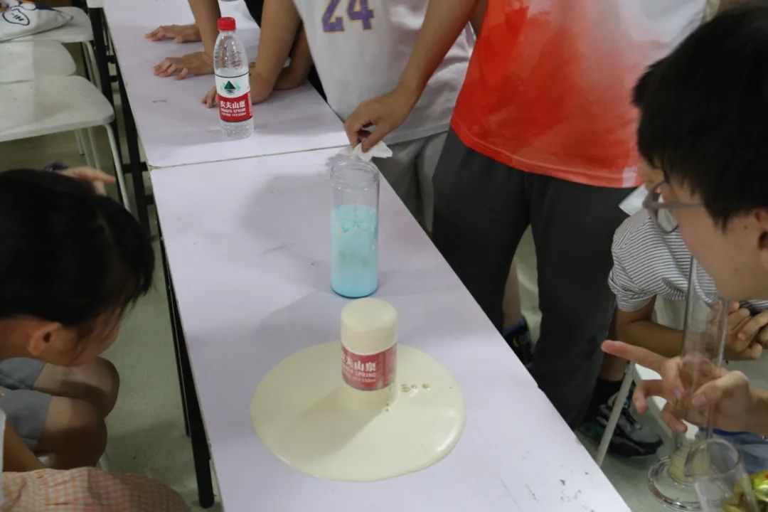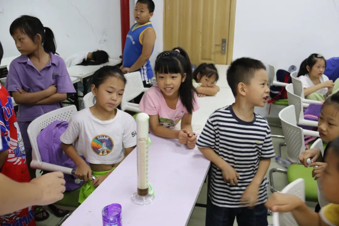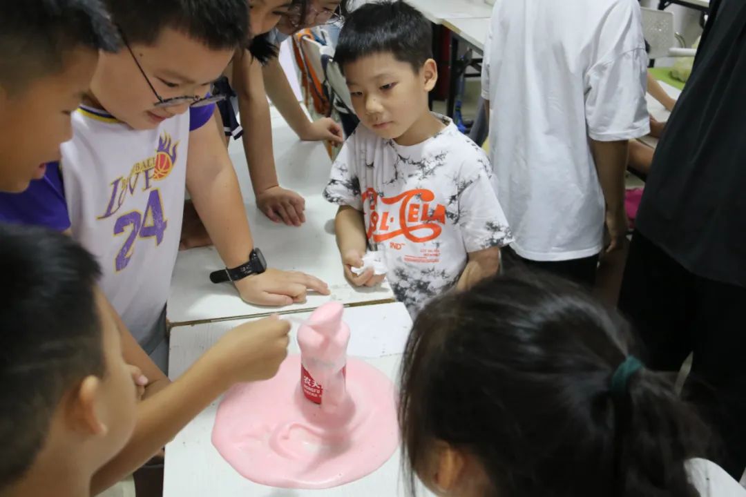 实验过程中,大学生志愿者将孩子们分成六个小组,小组化管理指导他们进行安全实验。为使得实验效果更加明显,志愿者还挑选了不同颜色的色素加入试剂。实验终于开始了,孩子们兴奋又好奇地围在老师身边,观看到大量的泡沫喷薄出多彩的画面,这神奇有趣的现象引得孩子们发出一阵阵惊呼。每次泡沫“嗖”地像喷泉一样从容器中喷涌而出,似巨大的“牙膏”,也酷似大象的鼻子,把孩子们惊讶成一个个表情包。实验结束后,志愿者们带领孩子们清理实验后杂乱的桌面。而此时,孩子们仍然很兴奋,仍然沉浸在做实验的乐趣中。