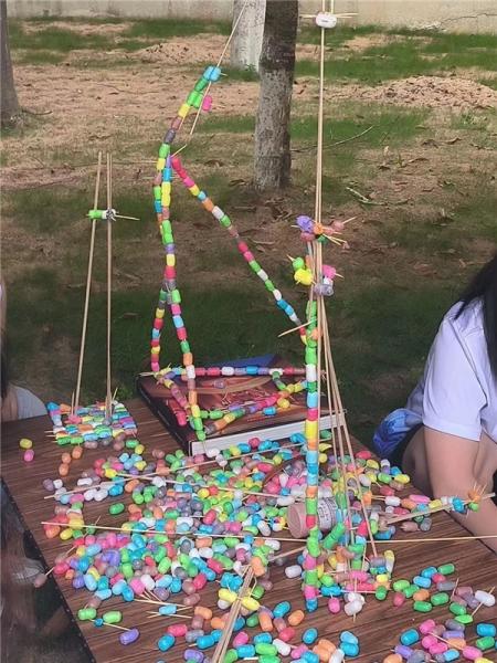 “我们做的是“通天塔”,我跟哥哥姐姐们先制作了基础,然后我们用木棍做了主体承重,然后用牙签连接在一起。”