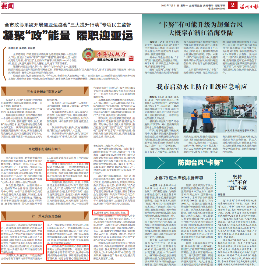 承办好亚运赛事,是省委省政府交给温州的重大政治任务,更事关温州的城市形象。秉持这一共识,今年6月份,市政协派出了三个监督组,围绕迎亚运盛会助力全市“三大提升行动”,开展省市县三级政协联动专项集体民主监督;发动全市12个县(市、区)政协同步开展联合监督,在全市政协系统掀起了助推“办好一个会、提升一座城”的热潮。