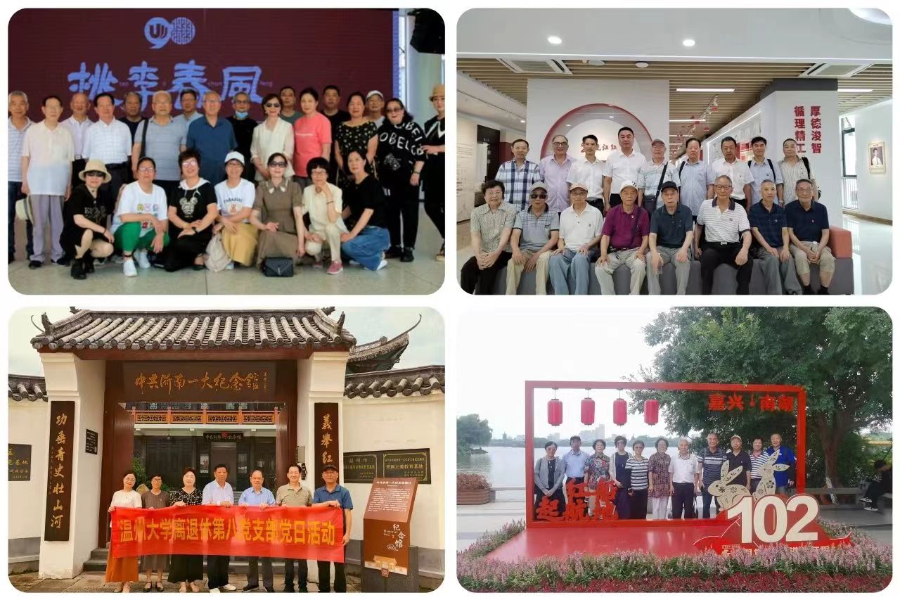 离退休第七党支部参观考察瓯海区泽雅镇千年纸山唐宅村和龙舟运动中心。离退休第一党支部赴温大茶山校区开展返校参观活动。离退休第十三党支部组织党员到福建平潭岛参观考察。离退休第十二党支部参观考察温理工新校园和新落成的“瓯江红”党群服务中心。离退休第八党支部赴中共浙南第一次代表大会纪念馆开展主题党日活动。离退休第十五党支部到嘉兴中共一大“红船”和南湖革命烈士纪念馆开展主题党日活动。支部书记吴小宇、张汝潮参加市委老干部局组织的浙江东方职业技术学院等地“走、看、促”活动。