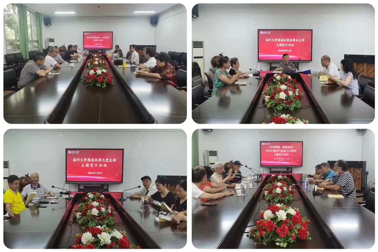 离退休第三党支部联合马克思主义学院研究生党支部开展“师生共学党章 重温入党誓词”主题党日活动。离退休第十党支部与温州工艺美术研究院公司党支部一起举办“迎七一,红色薪火永相传”主题党日活动。离退休第二、四党支部共同召开党员大会,专题学习“在‘两个结合’中开辟马克思主义中国化时代化新境界”和“习近平新时代中国特色社会主义思想的世界观和方法论”。离退休第十三、十四党支部邀请张小燕教授为两个支部的党员作题为《归根到底两个“行”》的讲座。离退休第五、六、九、十一、十五党支部分别组织理论学习会,学习《习近平新时代中国特色社会主义思想学习纲要》、习近平总书记重要讲话“人民对美好生活的向往,就是我们的奋斗目标”及相关论述、《中央党内法规制定工作规划纲要(2023-2027年)》、《人民日报》“七一”社论《汇聚强国建设民族复兴的磅礴伟力》等。