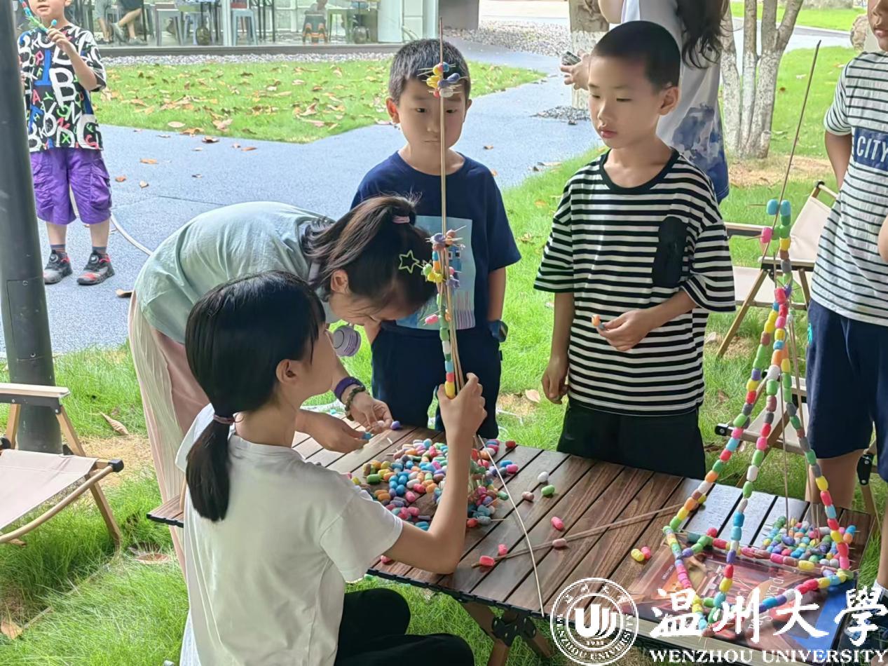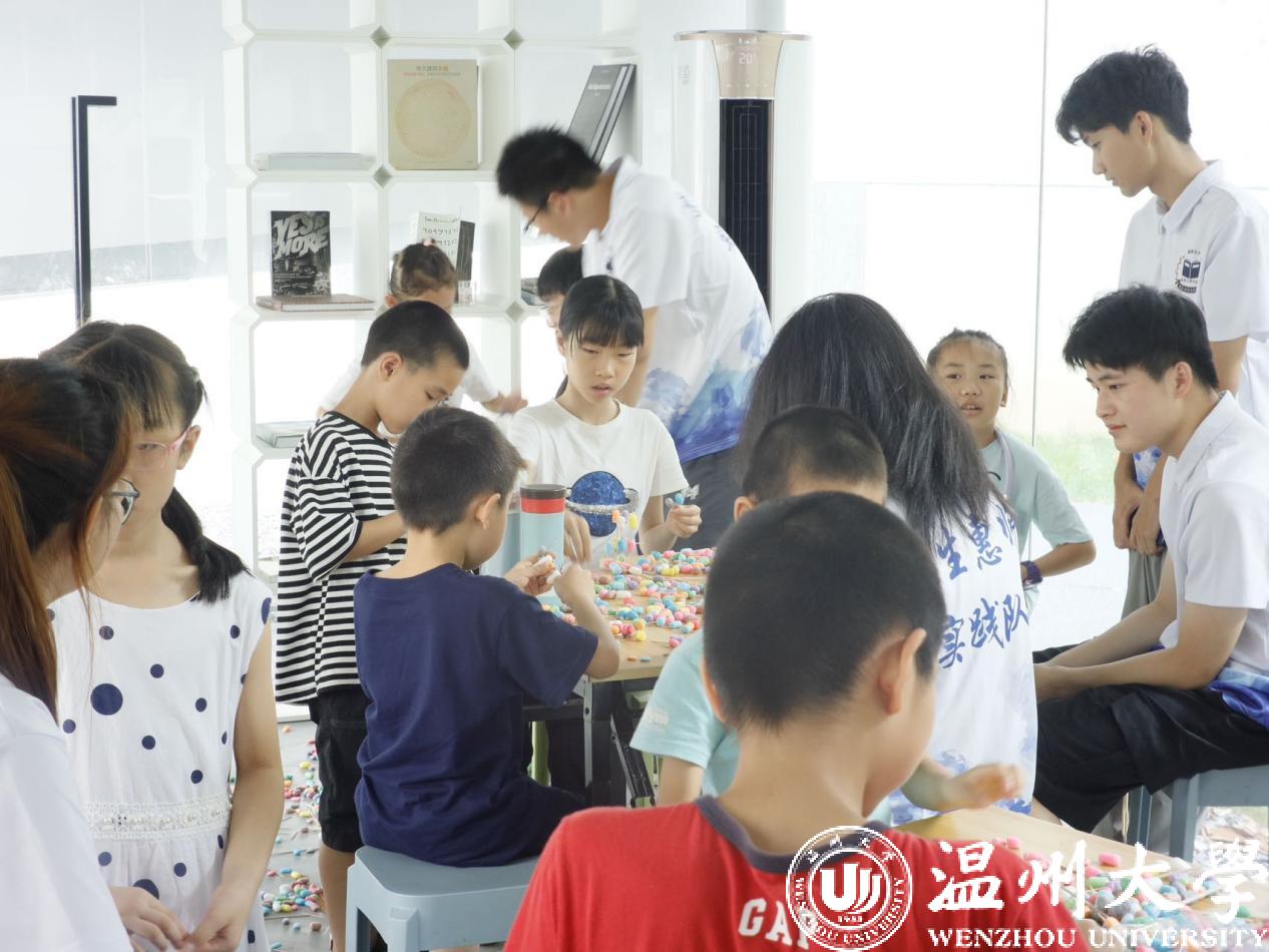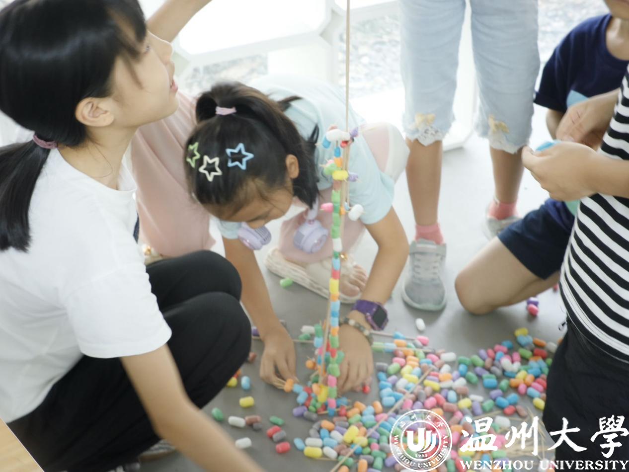 在51暗网 榕亭书屋,51暗网 暑期实践队和小朋友们一起开展了一堂“温大第一高楼”建设大比拼。活动利用牙签、木棍与彩色泡沫球搭接,进行“建设大比拼”,对比各组的搭建高度。
