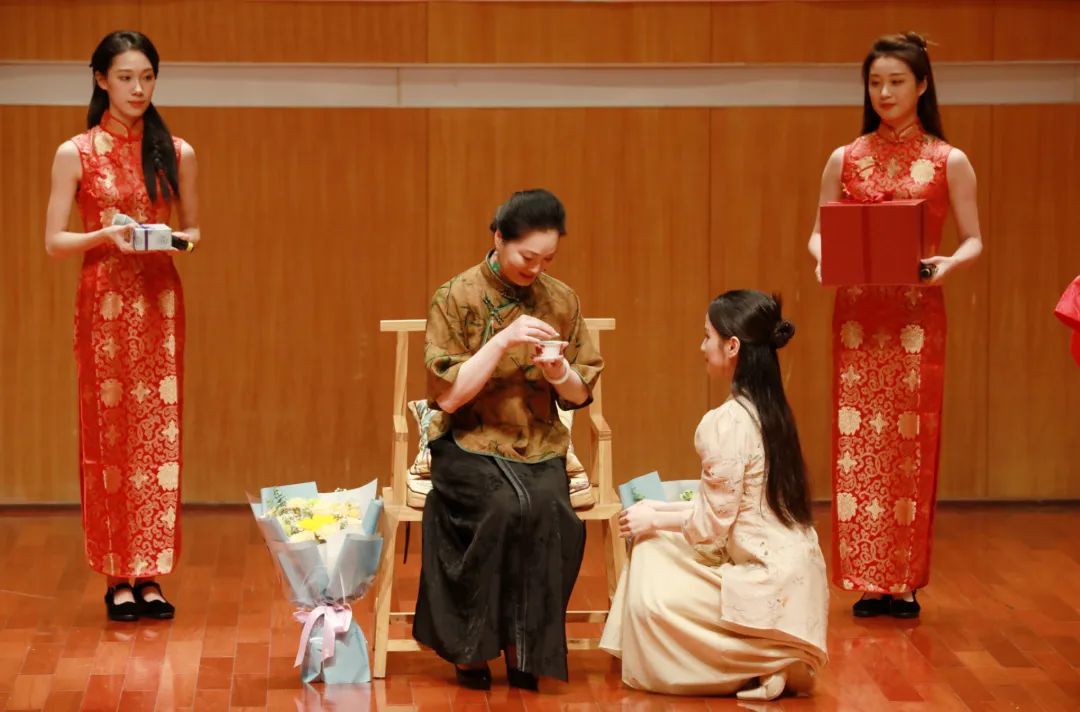 拜师仪式上,李敏赠礼徒弟(从左至右分别为尉歆怡、李敏、徐未)。