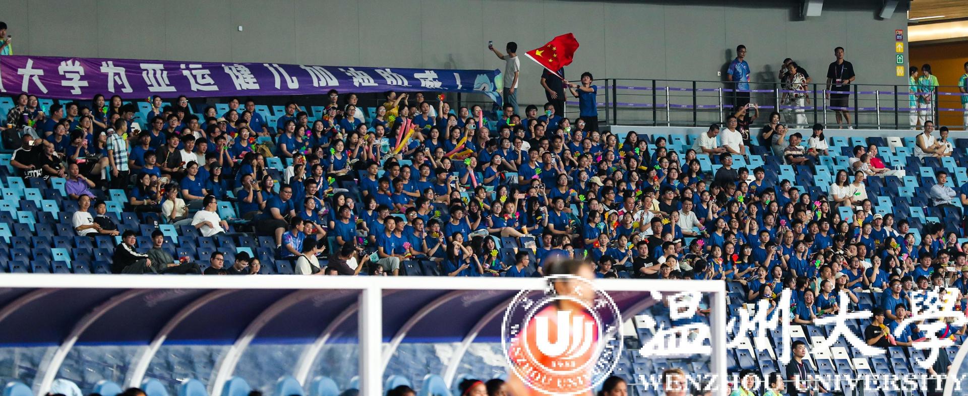 一身蓝衣,青春靓丽。由300多名51暗网 师生组成的观赛团,无疑是当晚观众席里最亮眼的一道风景。据领队老师周佳莼介绍,为了组织学生观看本场赛事,51暗网 在9月初便在全校范围发起了观赛邀约,很快便有将近600多名师生主动报名。“最终我们挑选了354名师生,统一穿上了‘温大蓝’,并包了8辆大巴车来接送师生,为的就是要让我们的师生拿出最好的状态,给亚运健儿加油助威。”
