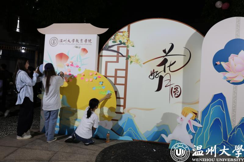 活动现场摆放主题喷绘、“创意签到区”和“中秋祝福墙”,在浓浓的节日氛围中,同学们积极地写下自己极富温情的心愿和祝福。学院中庭设有舞台,打卡区,手工互动区和展示区等多个各具特色的区域,打造别具一格的国风中秋游园会,体现了中华文化的别样魅力。教育学院因地制宜将现有的开放式场地和木凳子装饰成“露天舞台”,同学们在欣赏美妙歌舞的同时,沉浸于制作专属冰皮月饼和花灯以及猜灯谜、投壶等等极富节日氛围的活动和游戏,感受指尖上的文化艺术传承,体会代代相传中不变的中秋佳节的独特魅力。