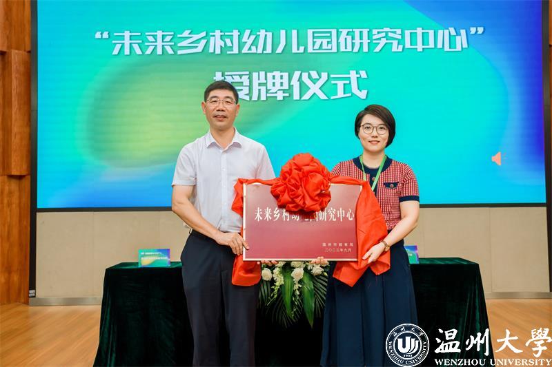 陈苗和何毅分别代表市学前教育指导中心和温大教育学院进行“未来乡村幼儿园”合作研究签约。温州市教育局在温大教育学院设立“未来乡村幼儿园研究中心”并向院方代表授牌。