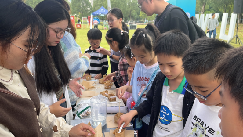 将纸片折成了一个小小的盒子,挑选自己喜欢的昆虫标本放置于小盒子之中,在志愿者的帮助下倒注琼脂……在志愿者们的引导下,小记者们亲手制作了一个昆虫琥珀。而后,小记者们还在志愿者的引领下,分别走进植物摊位、环境摊位等摊位前,动手制作了美丽书签、水龙头过滤器等。