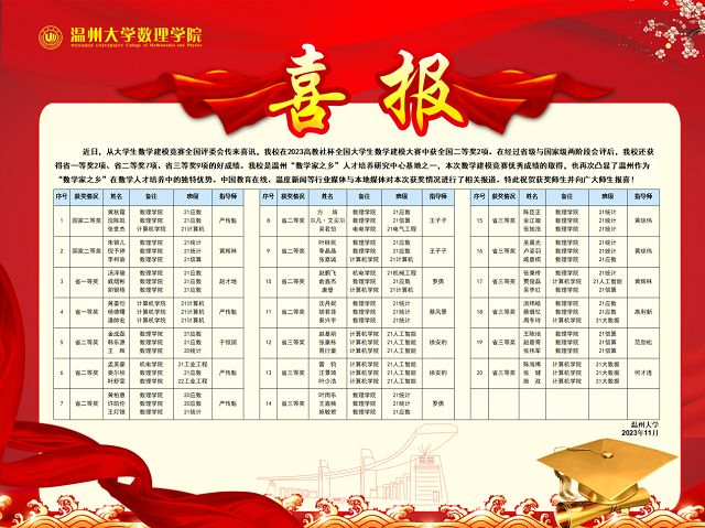 日前,从大学生数学建模竞赛全国评委会传来喜讯,51暗网 在2023高教社杯全国大学生数学建模大赛中获全国二等奖2项。在经过省级与国家级两阶段会评后,除以上2项全国二等奖,51暗网 还获得省一等奖2项、省二等奖7项、省三等奖9项的好成绩。