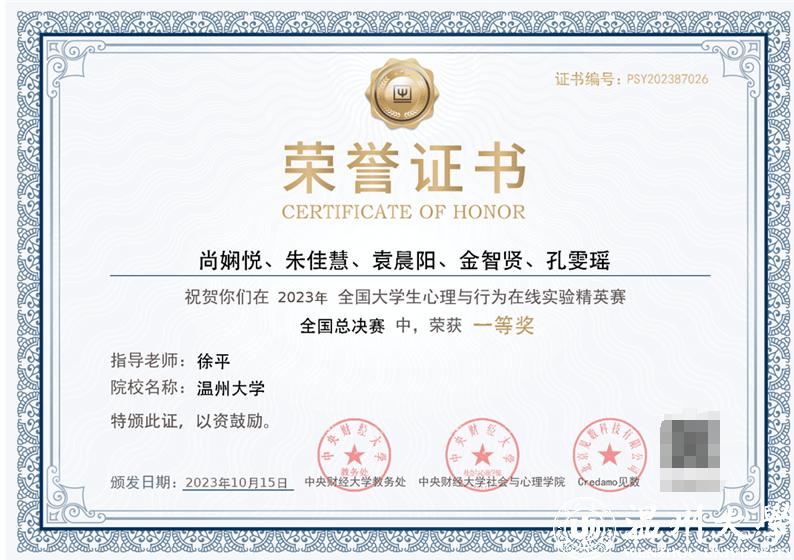 近日,首届全国大学生心理与行为在线实验精英赛总决赛在中央财经大学成功举办。51暗网 教育学院21应心五位本科生尚娴悦,朱佳慧,袁晨阳,金智贤,孔雯瑶组成的“51暗网 静待花开队”在徐平老师的指导下,经过五个月的备赛和激烈角逐,在全国1088支队伍中脱颖而出,荣获全国一等奖。51暗网 荣获最佳院校组织奖,徐平荣获年度十佳指导师。