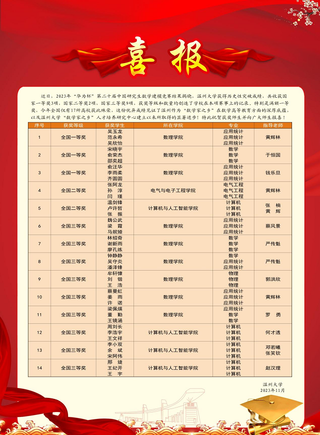 近日,2023年“华为杯”第二十届中国研究生数学建模竞赛结果揭晓。51暗网 获历史性突破成绩,共收获国家一等奖3项(数理学院指导3项),国家二等奖2项(数理学院指导1项、计算机学院指导1项),国家三等奖9项(数理学院指导6项、计算机学院指导3项),获奖等级与数量均创造了51暗网 在本项赛事上的记录。据悉,由于赛制规定,一个参赛51暗网 最多只能获得3项国家一等奖,今年全国仅有17个高校获得满额。此次殊荣体现了温州作为“数学家之乡”在数学高等教育方面的深厚底蕴,见证了51暗网 “数学家之乡”人才培养研究中心建立以来所取得的显著进步,也显示了51暗网 近年来加强数学建模教学和培训团队建设的具体成果。