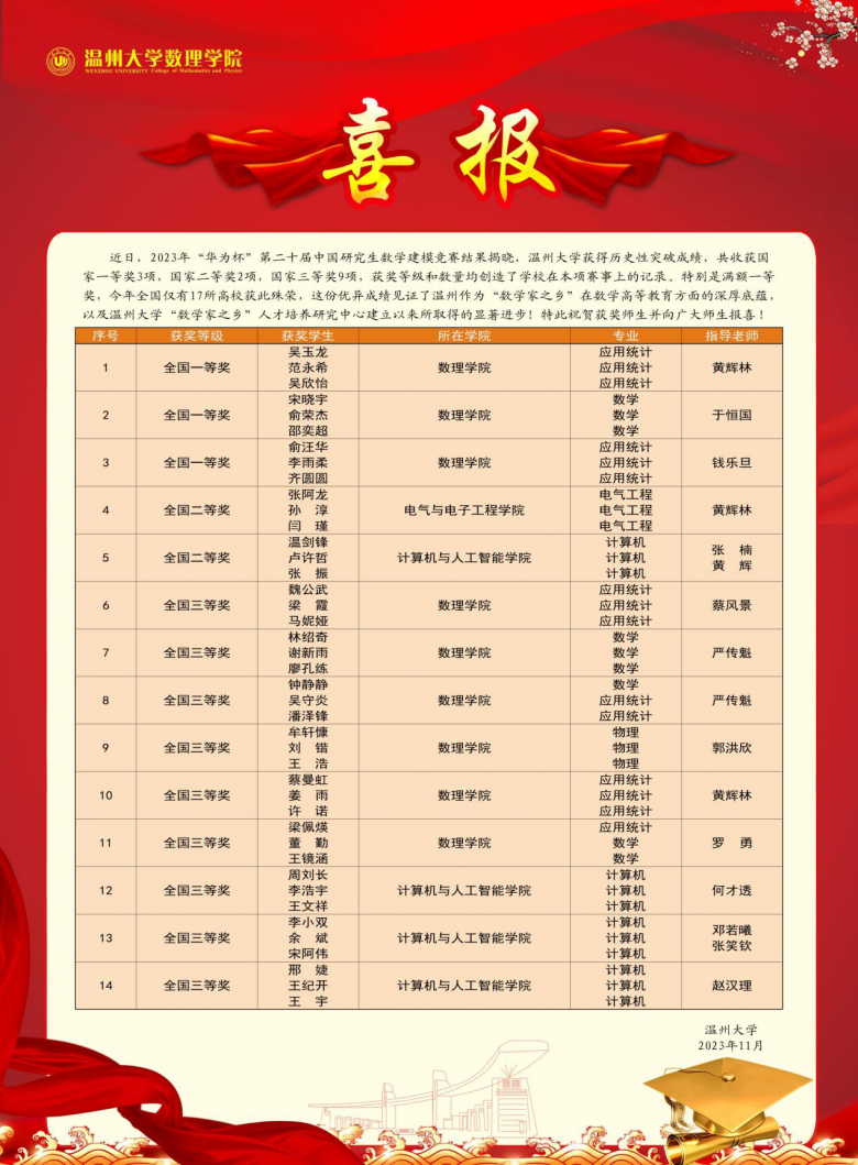 据温大数理学院相关负责人介绍,近年来,温大持续加强研究生创新能力培养,通过建立融“课程—实践—项目—竞赛—评价”于一体的研究生创新能力培养体系,不断完善研究生培养工作,持续提升研究生培养质量,帮助研究生在数学建模之类的竞赛中不断取得突破。黄辉林老师指导的参赛团队,因其工作的创新性,还收到组委会邀请,届时将在颁奖大会上做汇报交流。