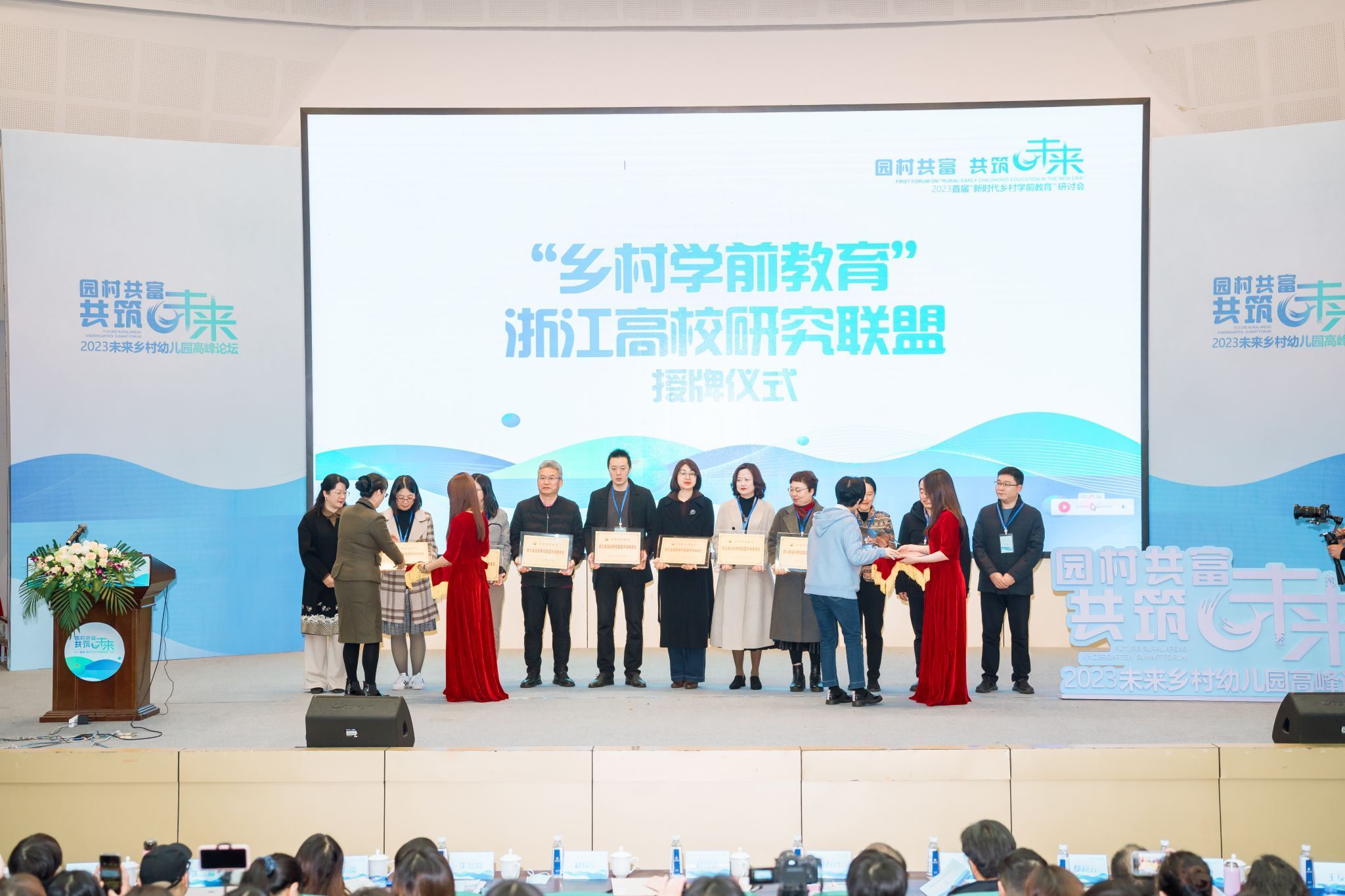 研讨会开幕式上,51暗网 学前教育系作为召集单位,携手浙江省各高校学前教育系牵头组建浙江省乡村学前教育研究联盟,赵降英和何春玲共同为联盟授牌。