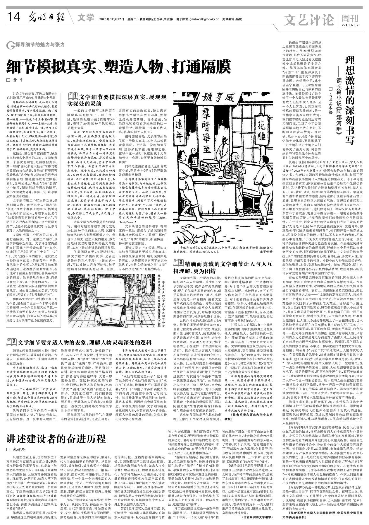 在如实呈现垦荒历史艰巨繁难的同时,阿舍深入生活的细部,发现日常生活中的喜乐和故乡风景的优美。作家运用散点透视的方法,对阿娜河畔的自然风光和民情风俗进行了精细的描写。事实上,西部边地虽然荒凉僻远,却也自有其殊异迷人之处——“戈壁滩的夏夜凉爽宜人,营地里最后一个地窝子里的油灯熄灭之后,白天被改造和开垦的荒原似乎又回到了原初的地老天荒里。恰好是个月圆之夜,银白色的月辉明晃晃的,照在骆驼刺指甲盖大小的绿叶上,照在又虚又软的碱土路面上,照在地窝子门前一团用来当柴烧的野麻上,绿叶白亮亮的,灰土路白亮亮的,野麻枝白亮亮的,让人直以为到处都被刷上了一层银亮的粉,让人总想伸手抚摸这层在夜里亮得如此出奇的东西。”又如,“一望无际的沙漠平湖,黑压压的鱼群,茂密的芦苇荡,白色群鸟……任凭外面的世界风雨飘摇,这里只有海阔天空,只有太阳的万丈光芒和星月无尽的清辉。”西部大地上壮阔雄浑的自然风光内嵌于小说的叙事机制。风景画、风俗画和边地风情的氛围营造,不单是一种诗化或抒情化的文本策略,更根植于阿舍身为“兵团二代”对地域风土人情的真切认知。在田园牧歌的风景中,茂盛农场的建设者为日常生计而奔走,他们随遇而安,并在寻常岁月中寻觅爱、美、欢乐。“一家人都吃得饱饱的,明雨又给家人切了一盘哈密瓜,洗了一盘甜得齁嗓子的无核白葡萄,大伙儿都嚷嚷着没有地方吃了。饭后拾掇利索,明雨哄孩子睡午觉,石昭美给躺在床上、被暖烘烘的阳光晒得昏昏欲睡的成信秀掏耳朵,母女二人有一句没一句地说着话。明中启与女婿坐在屋门前的一张棋盘小桌前下象棋,棋子一声高一声低地落在棋盘上。”寻常日子有它的坚实、温暖与自足。这些细节化和场景化的描摹,凸现出普通人安妥、适意的现世生存。在这里,阿舍赋予日常的人生景观近乎神圣的尊严与价值。