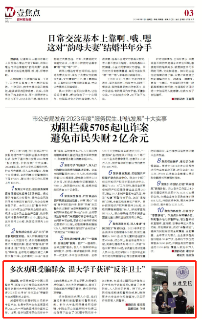 戚熠彬现为数理学院21级数学专业学生,也是学院学生会主席团成员,他从大一开始就坚持反诈宣传工作。近期,他参加瓯海茶山反诈分中心的志愿者工作,尽心尽责,积极普及反诈知识,多次劝阻受骗群众,得到了茶山派出所干警们的高度肯定,最终获评此项殊荣。