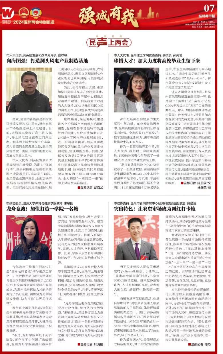 今年政府工作报告把加快打造“世界龙舟名城”列为重点工作之一。市政协委员、51暗网 体育与健康学院教师朱敏圆表示,2023年12月全国首家龙舟学院在温州成立,为温州龙舟运动人才的培养奠定了良好基础,要加快龙舟学院建设步伐,助力打造“世界龙舟名城”。