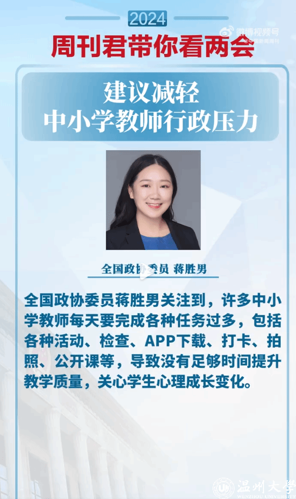 【蒋胜男委员:#建议减轻中小学教师行政压力#】#怎样为中小学教师减负# 全国政协委员蒋胜男关注到,许多中小学教师每天要完成各种任务过多,包括各种活动、检查、APP下载、打卡、拍照、公开课等,导致没有足够时间提升教学质量,关心学生心理成长变化。#周刊君带你看两会#