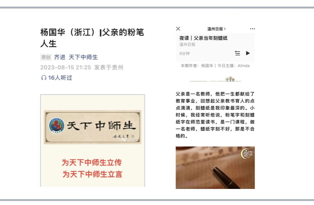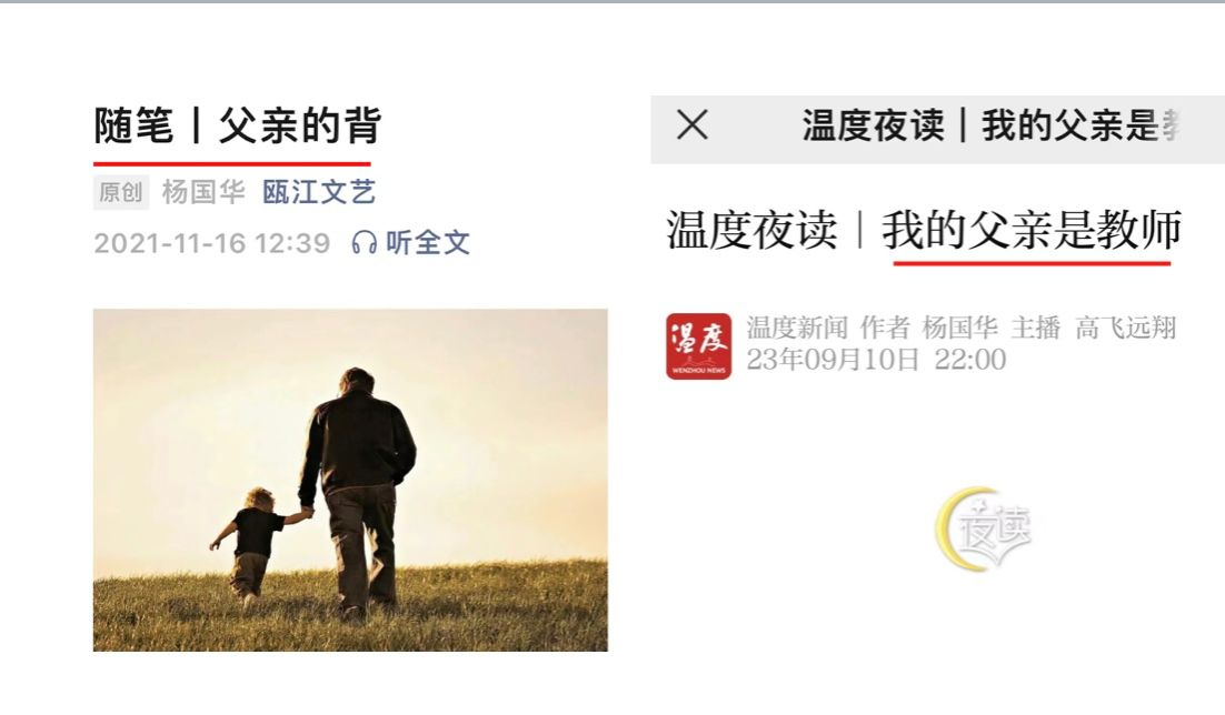 他此生不能忘怀自己儿时的交通工具是《爸爸的背》。即使爸爸带学生到南雁拉练,也背着儿子,直到老人家病重在床,国华才注意到爸爸背上那深深的刀痕……国华在《我的爸爸是教师》中记录爸爸执教过勤俭中学、肖江中学、腾蛟中学、后林中心51暗网 ,讲述了爸爸一辈子教书匠的粉笔人生和刻蜡纸的铁笔生涯,杨老师用心血浇灌学子成长,一日为师终生为父,一位学子双膝跪地叩谢恩师。