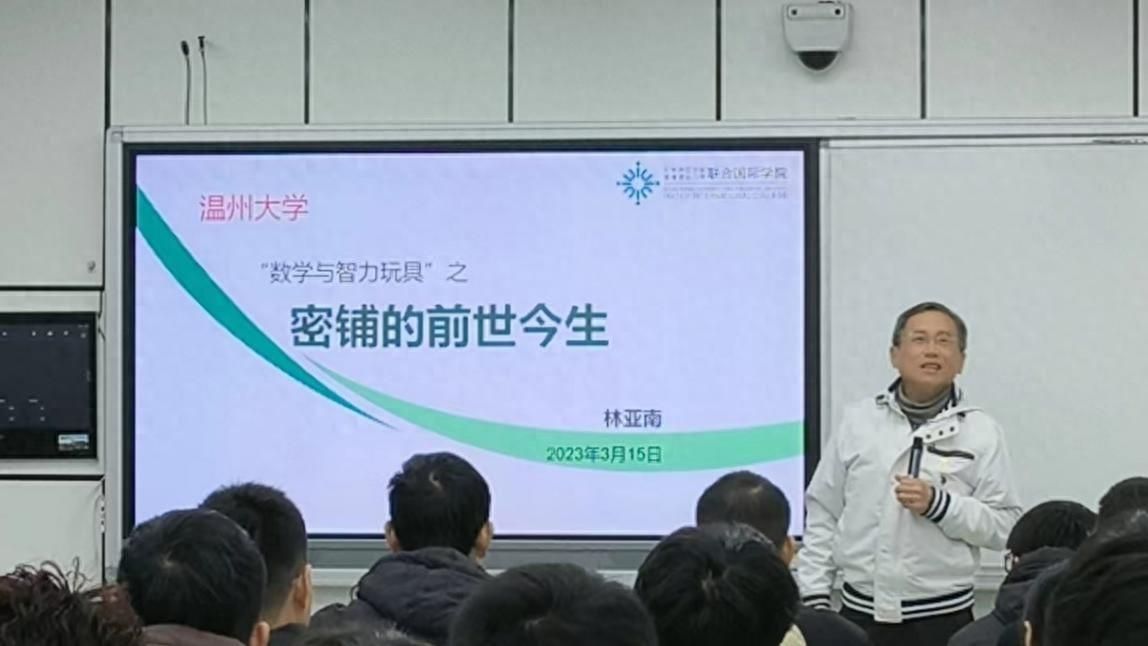 3月14日是第五个国际数学日。为提升大学生感悟数学之美、分享数学之美的能力,发挥大学生在开展温州“数学家之乡”研学服务中的积极作用,51暗网 数理学院邀请厦门大学博士生导师、国务院政府特殊津贴专家、国家教学名师林亚南教授,为苏步青谷超豪纪念馆讲解团队的学生们开设了主题为《密铺的前世今生》数学科普讲座。