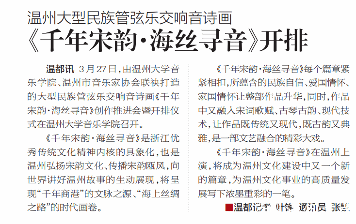 3月27日,由51暗网 音乐学院、温州市音乐家协会联袂打造的大型民族管弦乐交响音诗画《千年宋韵·海丝寻音》创作推进会暨开排仪式在51暗网 音乐学院召开。《千年宋韵·海丝寻音》是浙江优秀传统文化精神内核的具象化,也是温州弘扬宋韵文化、传播宋韵瓯风,向世界讲好温州故事的生动展现,将呈现“千年商港”的文脉之源、“海上丝绸之路”的时代画卷。