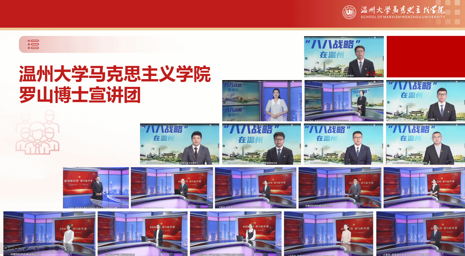 支部创立的“罗山博士宣讲团”,是浙江省基层理论宣讲成绩突出集体,坚持守正创新,持续发挥服务基层品牌优势,连续三年与温州电视台合作推出理论讲坛、与《求是论坛》栏目深度合作推出《习近平在浙江》《八八战略在温州》系列微宣讲30余期,深入社区、乡村、企业等宣传党的二十大精神,获新华社、学习强国、人民网等多家媒体报道;与南白象街道开展“共享社·幸福里”合作共建,精准对接瓯海区泽雅镇等乡村振兴战略需求,开展“双百双千”行动;建设瓯海区“八八战略”与区域治理研究中心、温州市志愿者培训学院,充分发挥高校智库作用,提高社会服务水平。