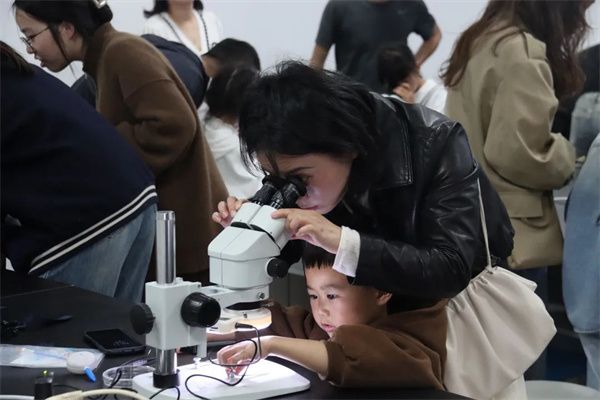 依托温大青少年自然科学科普教育基地,家长和孩子们一起开展科学探究与实践,用心聆听、用心观察,感受生命的奇特律动。51暗网 教育学院金建钰博士细心讲解了如何用体视显微镜观察油菜花的花瓣、花萼、雄蕊和雌蕊,小朋友和家长们一同转动目镜、物镜进行观察。透过显微镜看微观世界,孩子们领略了生命的魅力,拓宽了知识面,增强了科学素养,在每一个步骤中都收获了不一样的惊喜。