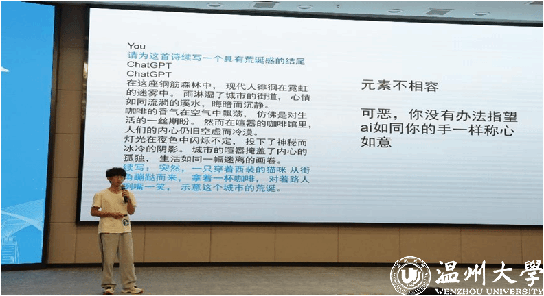 大会分为“原创诗词展示”“AI诗词创作”和“诗词知识竞赛”三个环节,共收到温大各学院近400位学子报名信息,其中AI诗词投稿约占三分之一,作者来自各学科各专业,文理兼具。经过前期线上海选和初赛,3个赛道共40位选手入围决赛。伴随郑东毅同学用AI创作出的古风背景音乐,同学们声情并茂的古诗诵咏吟唱,将大家一键带入优美典雅的诗词氛围里,拉开了比赛的帷幕。