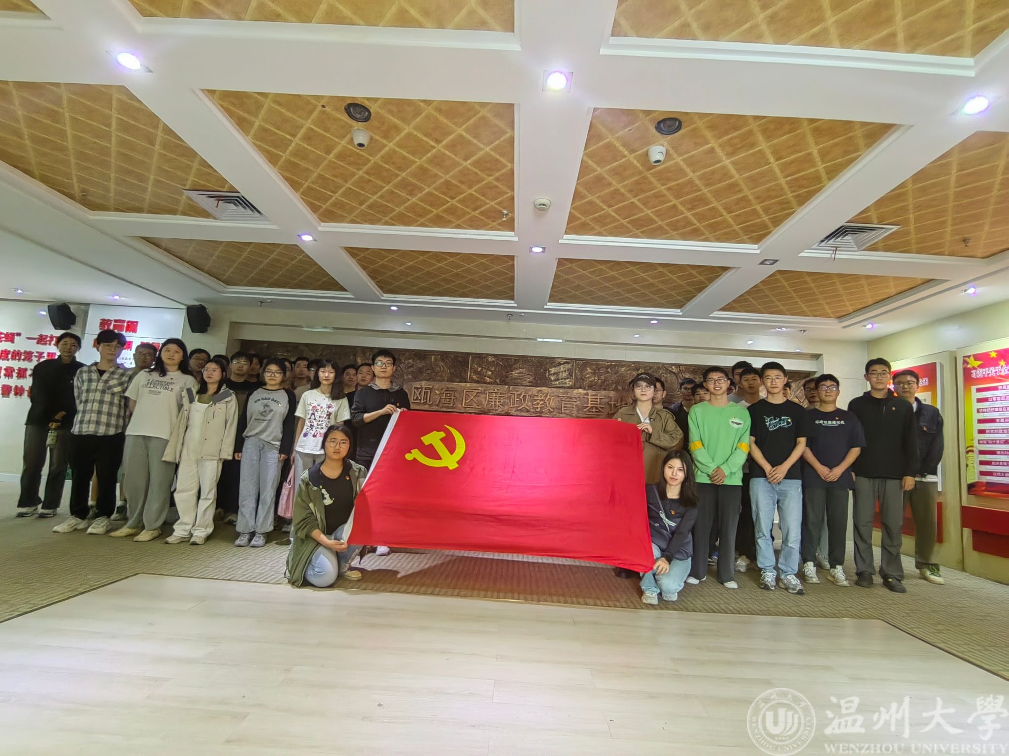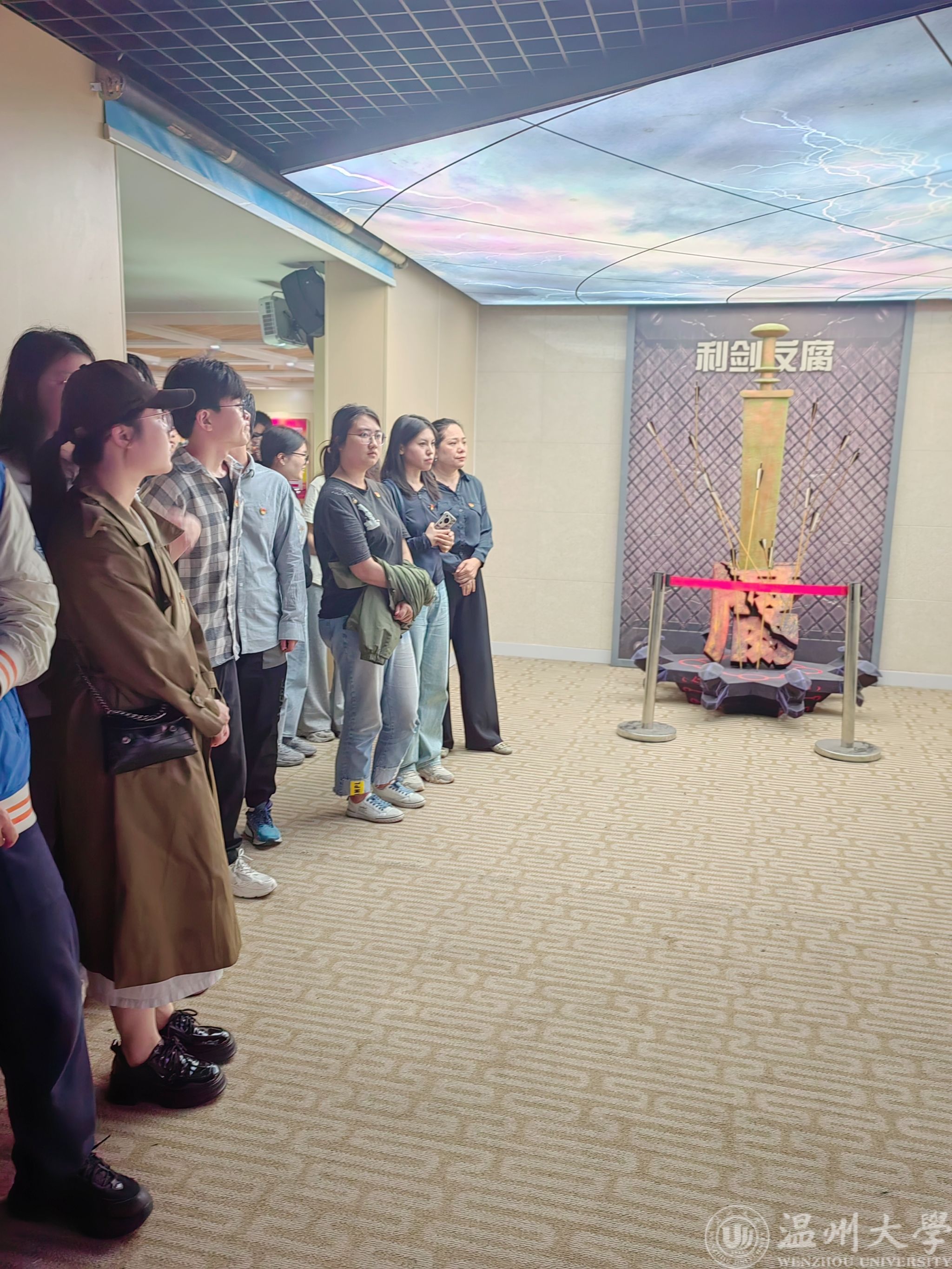 瓯海区廉政教育基地位于瓯海区行政中心二号楼五层,建筑面积500平方米。分为序厅和主展厅。在讲解员的带领下,全体毕业生党员首先参观了序厅。序厅正中有仿制的“刑鼎”,吊顶有“廉”艺术字型,地面上采用现代电子映射技术而作的“步步生莲(廉)”互动场景。序厅正前方是浮雕主题影壁墙,由多个富含“廉洁”寓意的元素构成。随后,大家跟随讲解员的脚步,参观了主展厅。主展厅分“教育篇、惩治篇、正气篇 、初心篇”共四个篇章,设有违纪违法典型案例、“弧幕”“电子翻书”“反腐利剑”“双屏互动”“礼与拷”等声光电技术场景。基地沉浸式的布展设计,现场丰富的警示教材,典型的案例分析,让全体毕业生党员在品鉴历史廉吏故事、当代案例记实、违纪心理分析、贪官痛心忏悔的同时,身临其境地上了一堂全面生动的反腐倡廉警示教育课,接受了廉政楷模和“清廉”故事带来的清廉文化熏陶,切实增强了拒腐防变的思想自觉和行动自觉。