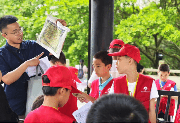 “拾级寻史”游戏结束后,小记者们围坐在了郭公山山顶的。富览亭是温州三大名古亭,建于宋代。另两座是华盖山的大观亭、积谷山的留云亭。