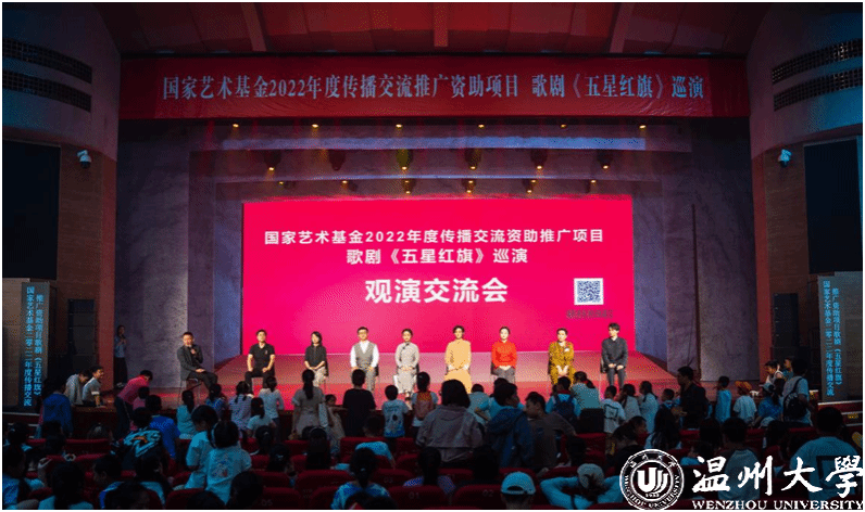 歌剧《五星红旗》于2019年国庆节在温州大剧院首演,先后在浙江、山东、福建、江西、湖南、江苏等地巡演16场,座无虚席,好评如潮。为确保巡演质量与效果,51暗网 音乐学院全体创作人员和参演师生通过师生共排、共演、共情,不断打磨提升、完善细节,打造了巡演版《五星红旗》,时长70分钟左右。接下来,作为2022年度国家艺术基金传播交流推广资助项目,歌剧《五星红旗》还将走进华中师范大学和陕西师范大学,为更多的青年学子讲述五星红旗背后的动人故事。