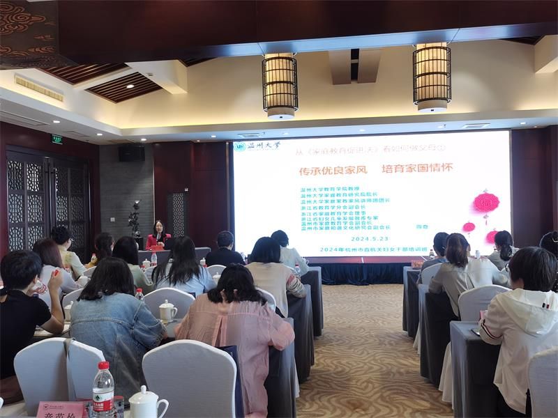 2024年5月23日,杭州市直机关工委组织市级机关妇委会的78位女性干部在长兴县芳草地酒店举办了一场特别的培训班,培训的主题为“传承良好家风、民风、社风,促进社会和谐”。本次培训班特别邀请了51暗网 教育学院教育学系党支部书记、51暗网 家庭教育研究院巾帼文明岗负责人、51暗网 家庭家教家风讲师团团长、浙江省教育学分会副会长、浙江省家庭教育讲师团成员、温州市家庭教育学会副会长、温州市家庭和谐文化研究会副会长周奇教授为妇女干部做《传承优良家风,培育家国情怀》的主题分享,旨在通过弘扬和传承中国传统美德,加强女性干部在家庭、职场和社会中的正面影响力。