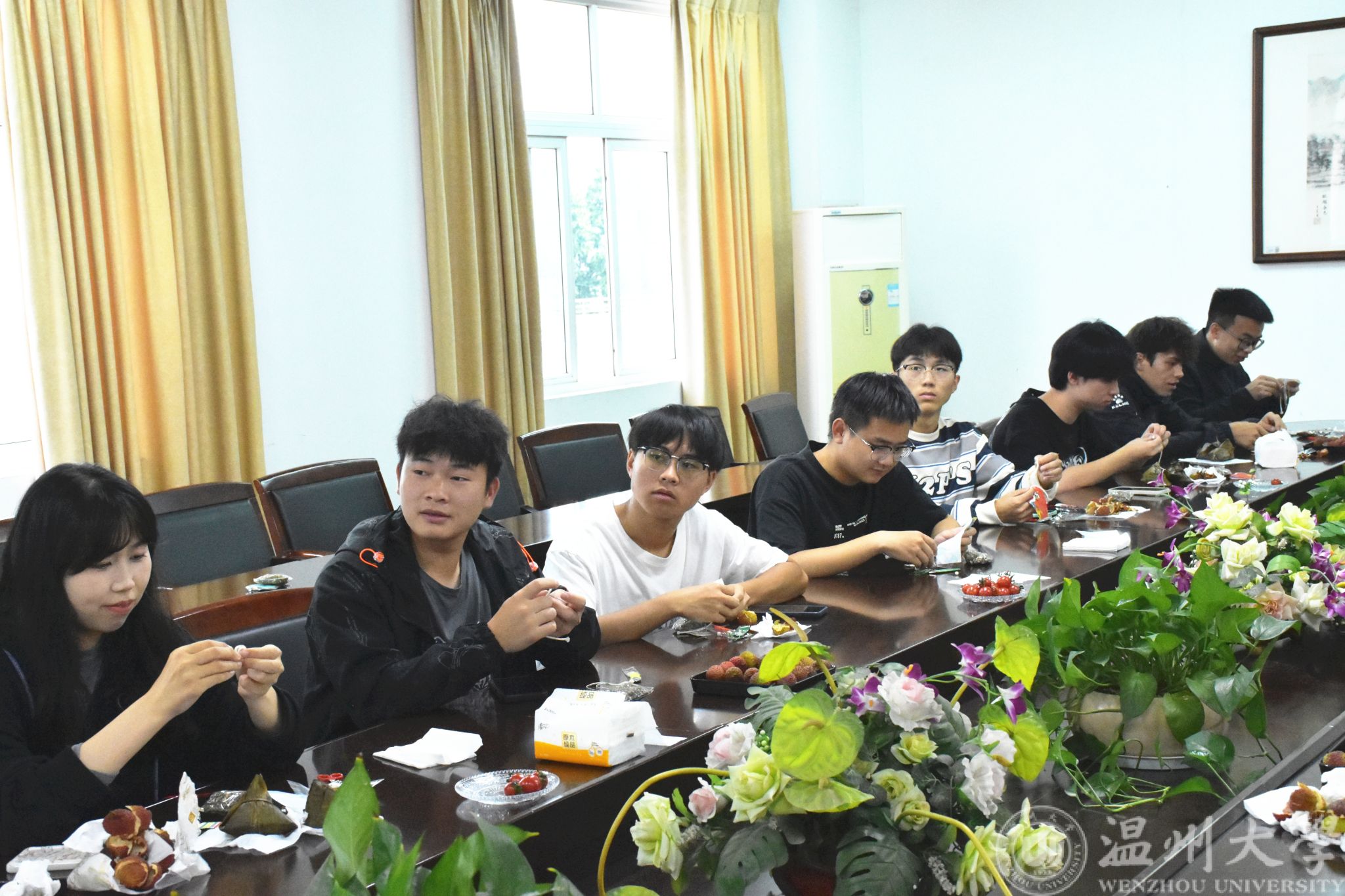 “快来尝尝温州特色的灰汤粽!”随着主持人的一声呼唤,热气腾腾的灰汤粽被端上了桌。这是温州地区独有的端午美食,将隔年稻草烧后留下的草木灰浸泡糯米,使得粽子色泽金黄、口感软糯。同学们围坐一圈,边品尝边交流,在艾香与粽香的环绕中,感受着非物质文化遗产的独特魅力。