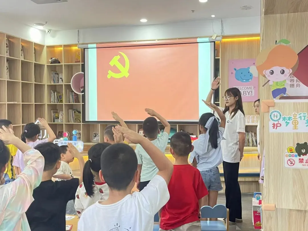 活动现场,51暗网 马克思主义学院小马实践队的志愿者带领未成年人一起了解建党节的由来。1921年7月23日,中国共产党第一次全国代表大会在上海秘密召开,后因安全问题而转移到嘉兴南湖的一艘游船上继续开会并圆满闭幕,此举标志着中国共产党的诞生。志愿者通过我问你答方式,来增加大家对党史的了解,最后邀请未成年人一起向党旗敬礼。