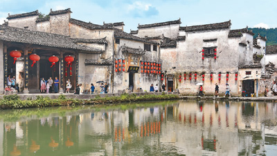 随着暑期旅游季的到来,享有“画里乡村”美誉的安徽省黄山市黟县宏村景区推出研学游、亲子游等多种旅游产品,图为游客在宏村景区游玩。