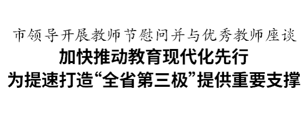 今天是我国第40个教师节,连日来,张振丰、葛益平、陈作荣等市领导走访慰问一线教职人员,向全市广大教师和教育工作者致以崇高敬意和节日问候,寄语大家深入学习贯彻习近平总书记关于教育的重要论述,落实立德树人根本任务,努力办好人民满意的教育,齐心协力打造教育高地,以教育现代化先行为温州提速打造“全省第三极”提供重要支撑。
