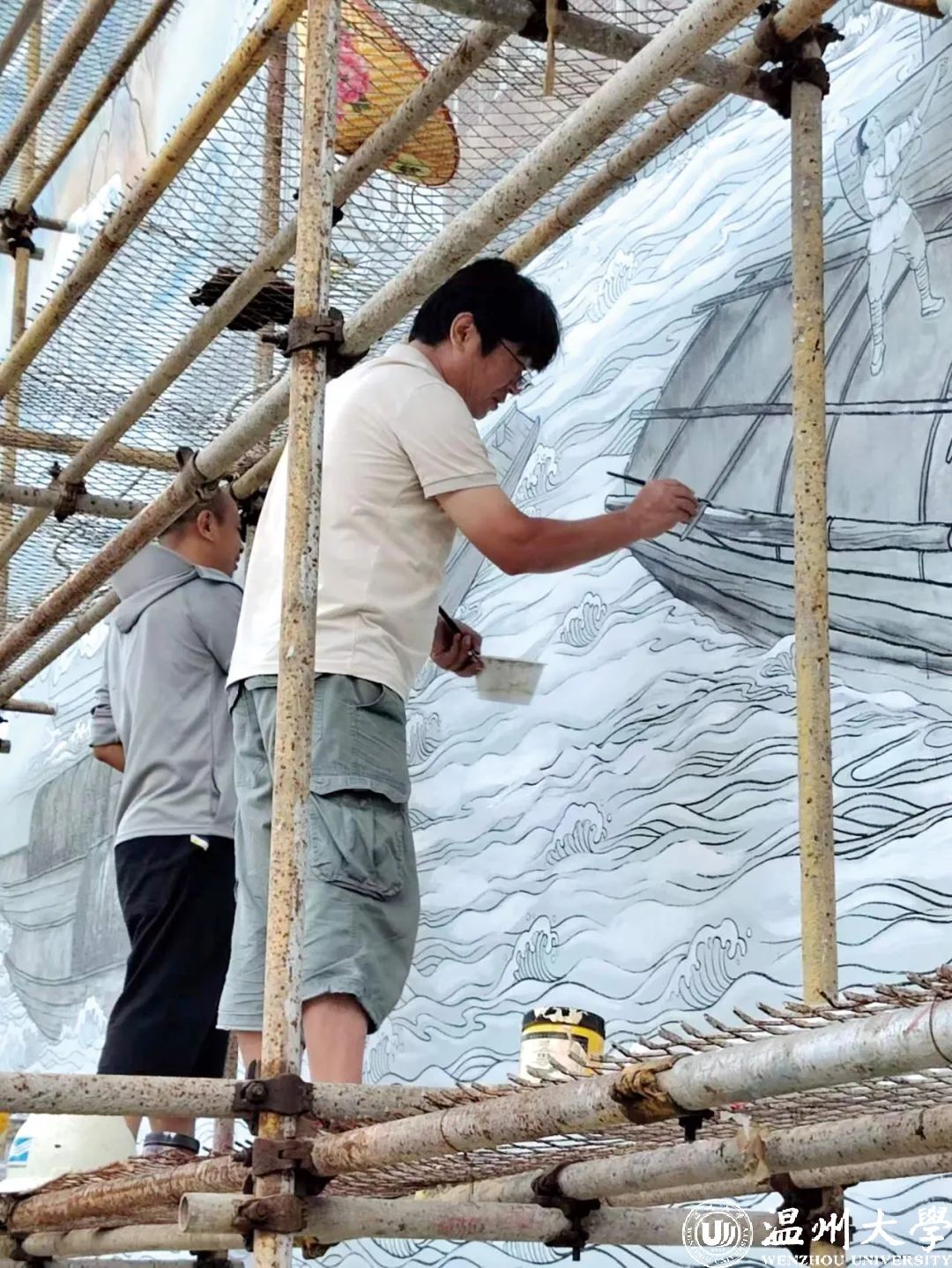 市区三垟湿地入口牌坊、瓯柑林、亲子乐园、水网密布的绿景……路过三垟大道下穿S1沿线的司机和乘客,可以观赏到绘有三垟湿地的代表性风景和标志性建筑的壁画。同样可以一饱眼福的,还有鹿城山福镇驿头驿阳村的村民,村里墙上富有古韵诗意的壁画《丝路瓯江》,为美丽乡村增添了人文气息。这两处公共艺术景观均由关明新设计并带队施工。作为拥有3个国家级协会会员身份的艺术家,他在不断提升自身美学修养的同时,还始终致力于提升大众审美。“这是我们美学学者的责任和义务。”他说道。