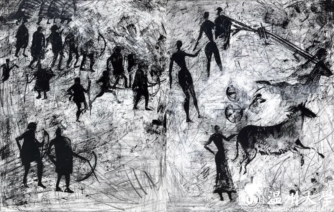 在追求美学的路途上,关明新更注重向内求索,在创作中留下了他对于艺术修炼的思考。随着美学修养的不断提升,关明新的壁画创作风格愈发鲜明写意,带有强烈的个人风格,创作思路也逐渐开阔、深刻,构建起一套个人的叙事方式和艺术语言表达体系。壁画《文明的印痕——人类的迁徙》入选2019年第十三届全国美展。这幅长卷壁画作品中,关明新采用了写意的结构,用概括形象的手法去描绘人类发展长河当中的步履和进程。“之江风华”美学公开课主理人郑睿如此评价关明新的作品:“是时代生活和精神的生动写照,具有时代的深刻烙印和特征,体现了在艺术语言稽古钩沉,发微抉隐的研究和探索上。”