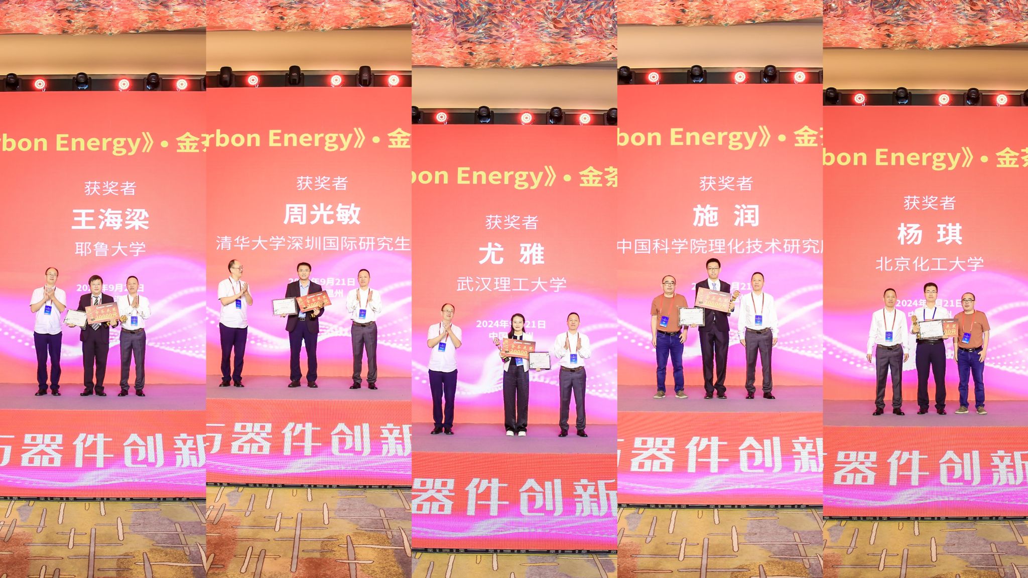 开幕式现场举行了中国科技期刊卓越行动计划“高起点新刊”《Carbon Energy》(碳能源)•金茶花奖颁奖仪式,该奖项为表彰在前沿研究领域作出贡献的40周岁以下的优秀青年科学家,共有耶鲁大学王海梁教授、清华大学周光敏教授、武汉理工大学尤雅教授、中国科学院理化技术研究所施润研究员、北京化工大学杨琪教授5位青年学者获奖。
