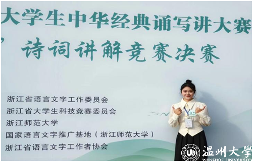 作为“00”后的一员,沈馨怡更是展现了这一代青年的独特魅力和风采。在竞赛领域,她不仅在省级中华经典诵写讲大赛中屡获一等奖,还代表浙江省参加国家级的“诗教中国”诗词讲解竞赛并斩获三等奖。此外,沈馨怡还积极投身社会实践和公益活动,担任51暗网 南白象附属实验小学“童音金话”拓展课负责人以及“伯温断案”廉洁作品导演等职务,她用自己的专业知识和热情为孩子们带去知识的乐趣,同时也通过艺术的形式传递廉洁文化,展现了当代大学生的社会责任感和使命感。她说道:“能传播温州声音、温大声音、“00后”声音,是我的幸运。”