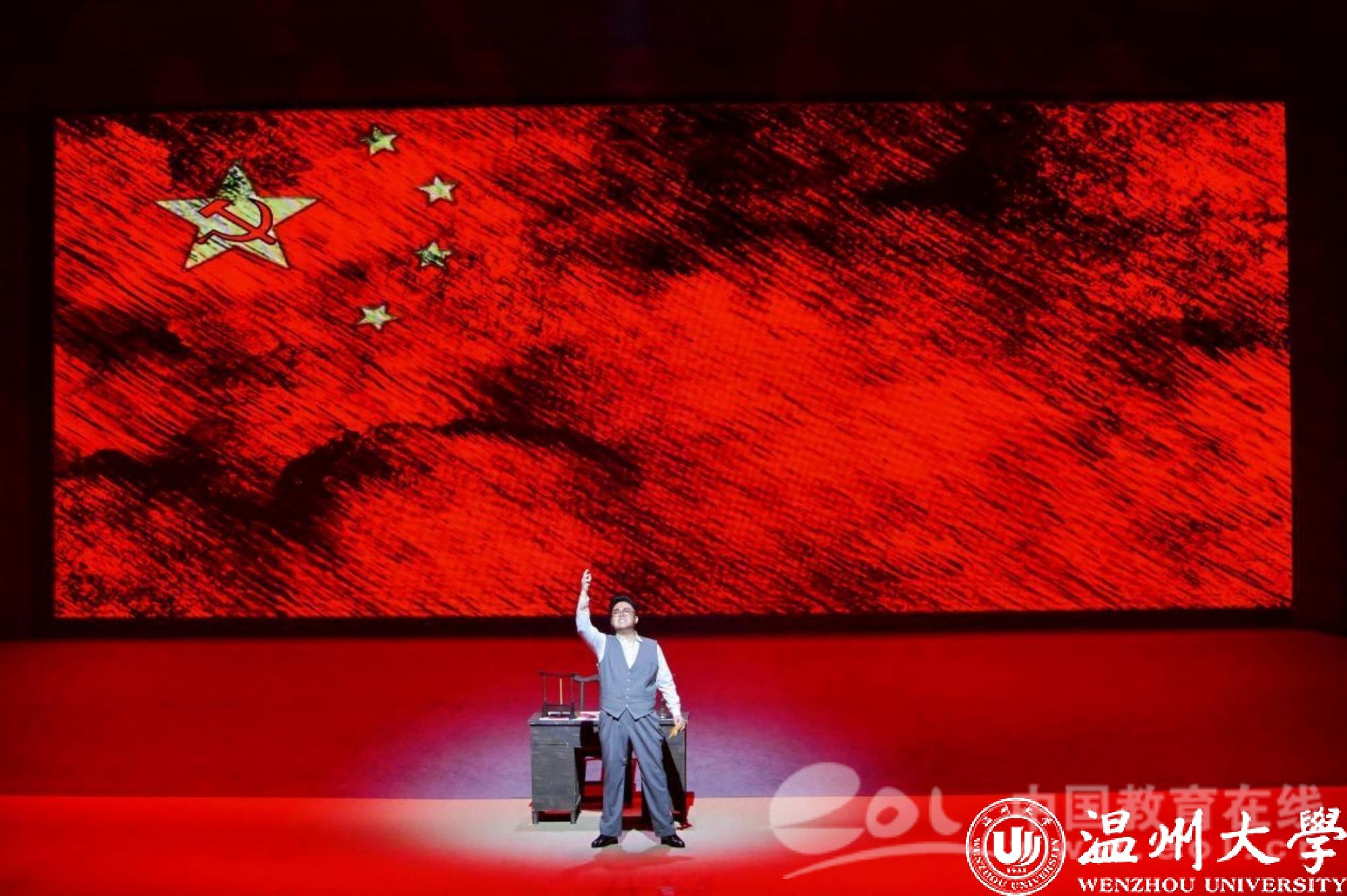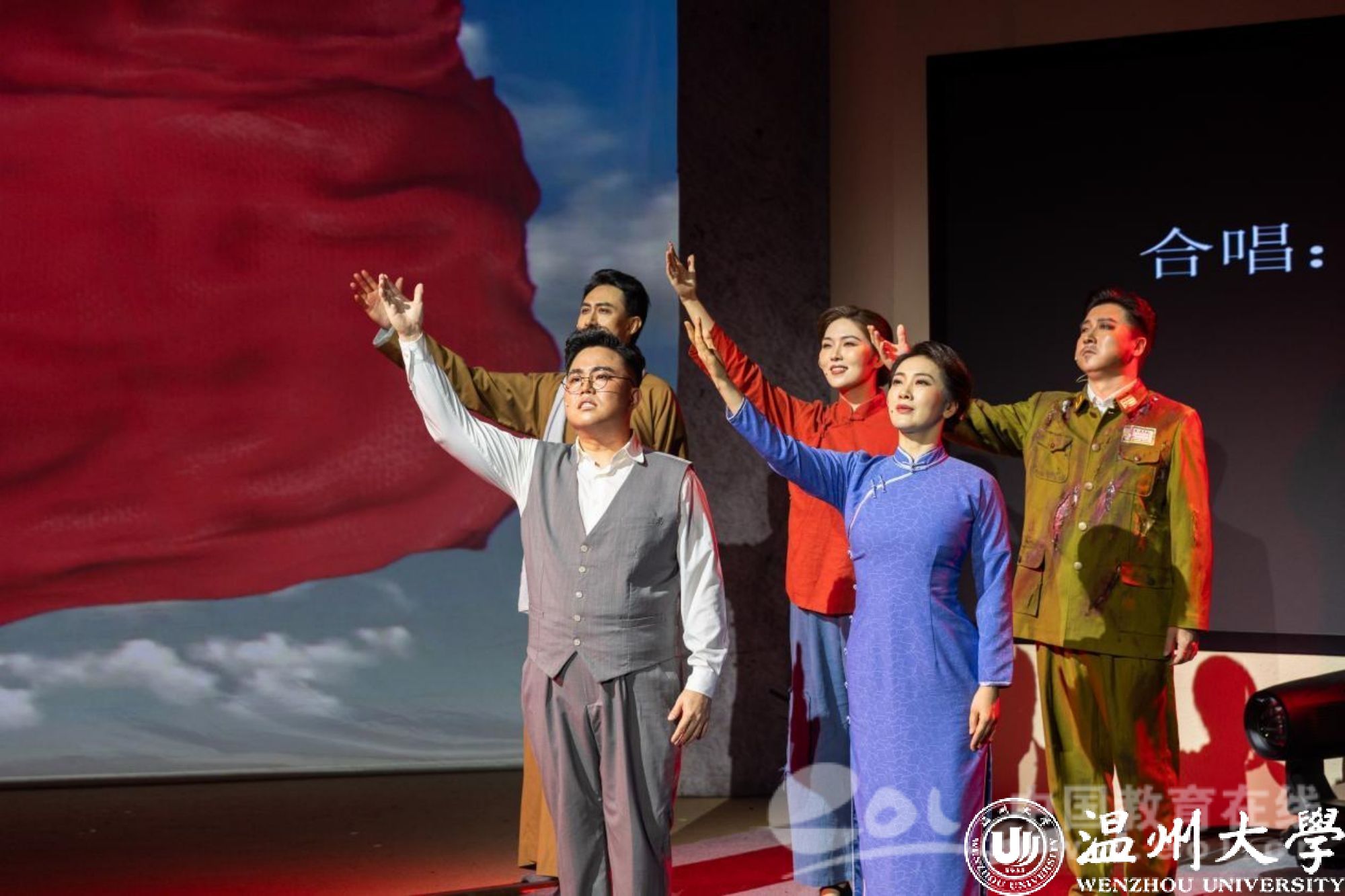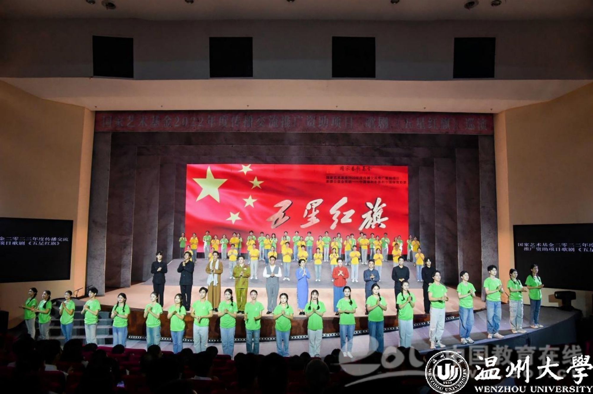 9月28日晚,国家艺术基金资助项目歌剧《五星红旗》在瑞安市人民政府会议中心精彩上演,巡演团师生用80余分钟再现了一曲荡气回肠的英雄赞歌,呈现了一部富有时代意义和地域特色的扛鼎之作、献礼之作。温州市委教育工委专职副书记、市教育局党委副书记张维凯、51暗网 党委副书记庄兴忠、51暗网 原党委副书记、教育发展基金会理事长牟德刚、51暗网 党委委员、组织部部长夏春雨、中共瑞安市委常委、宣传部部长孙寒星、参加新时代艺术思政教育研讨会的专家学者及广大市民1500余人现场观看演出。