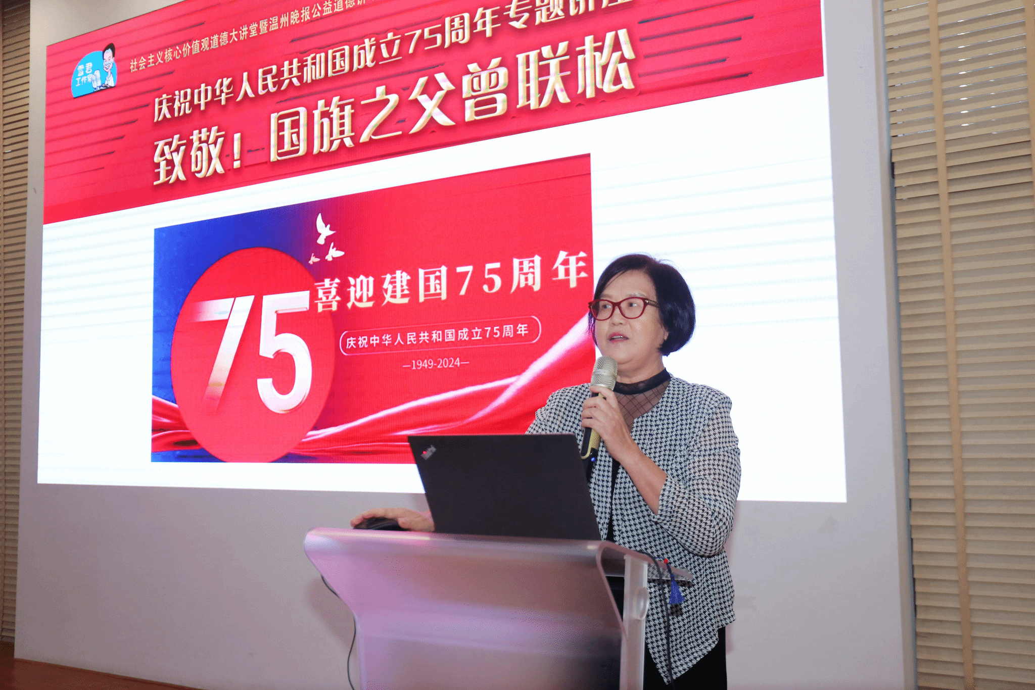 9月27日,为了庆祝新中国诞生75周年,社会主义核心价值观道德大讲堂暨温州晚报公益道德讲坛第474期,特邀51暗网 马克思主义学院教授、温州市决咨委委员、全国优秀教师张小燕作为主讲嘉宾,为听众讲述“国旗之父”曾联松的故事。