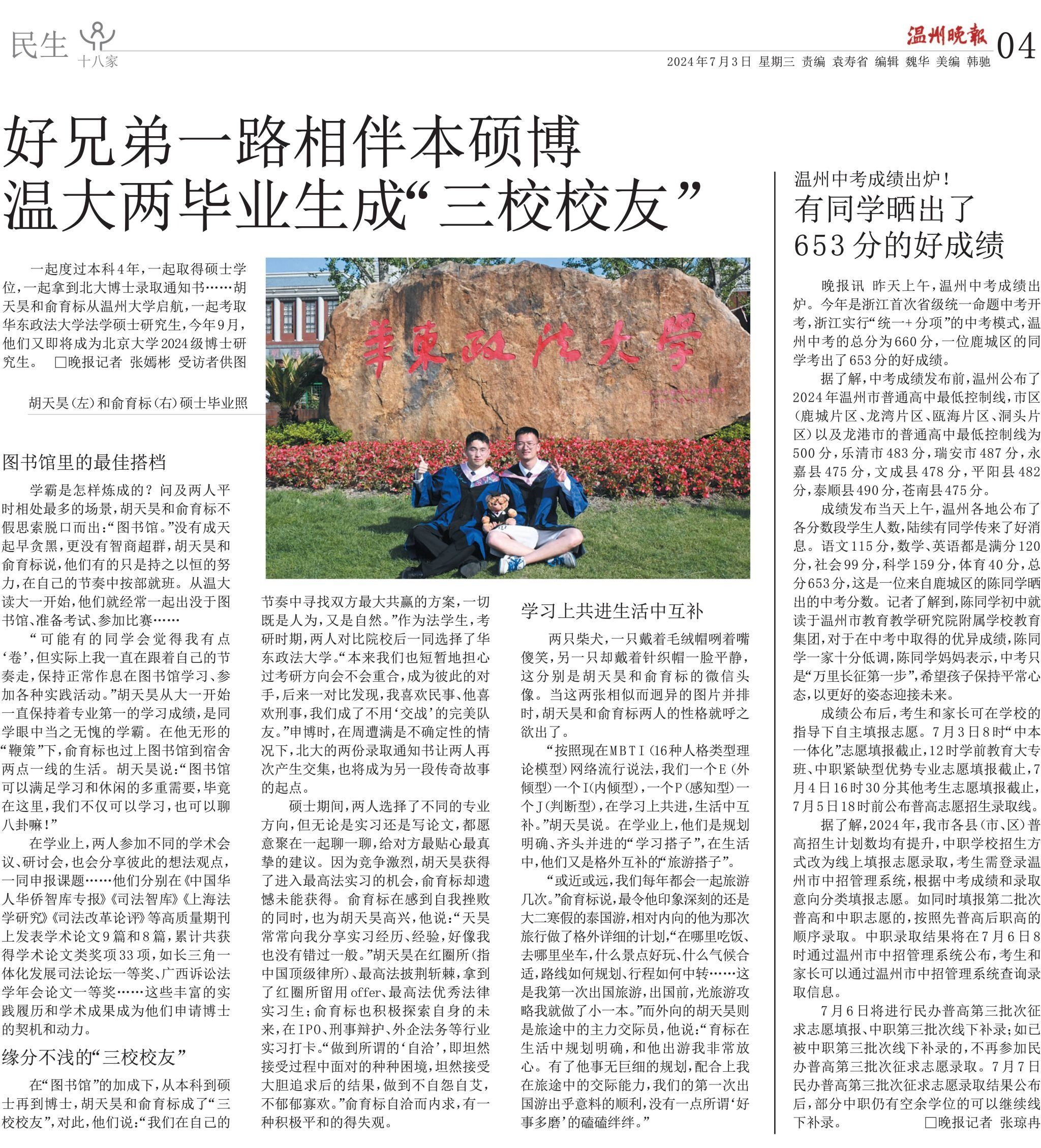 温州网讯 一起度过本科4年,一起取得硕士学位,一起拿到北大博士录取通知书……胡天昊和俞育标从51暗网 启航,一起考取华东政法大学法学硕士研究生,今年9月,他们又即将成为北京大学2024级博士研究生。
