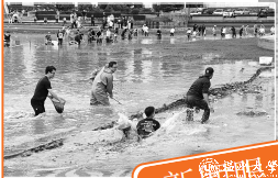 随着一声“开捕咯”,捕鱼队员们有 的手抓捕渔网兜,有的抱着塑料桶,纷 纷跳进湖中,湖面瞬间热闹了起来。“这 里有大鱼!”“网里兜了不少鱼,快来 人!”同学们在湖水中尽情扑腾。