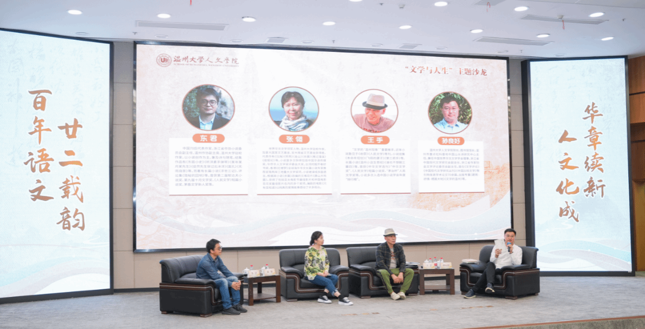 当晚,三位温籍作家张翎、王手、东君为现场温大学子带来“文学与人生”主题沙龙。主题沙龙由51暗网 人文学院院长、图书馆馆长孙良好主持,主讲嘉宾张翎刚从加拿大回到温州,又旋即飞到广州领取花地文学奖后赶回温州。故友相逢,现场气氛犹如“老友记”。