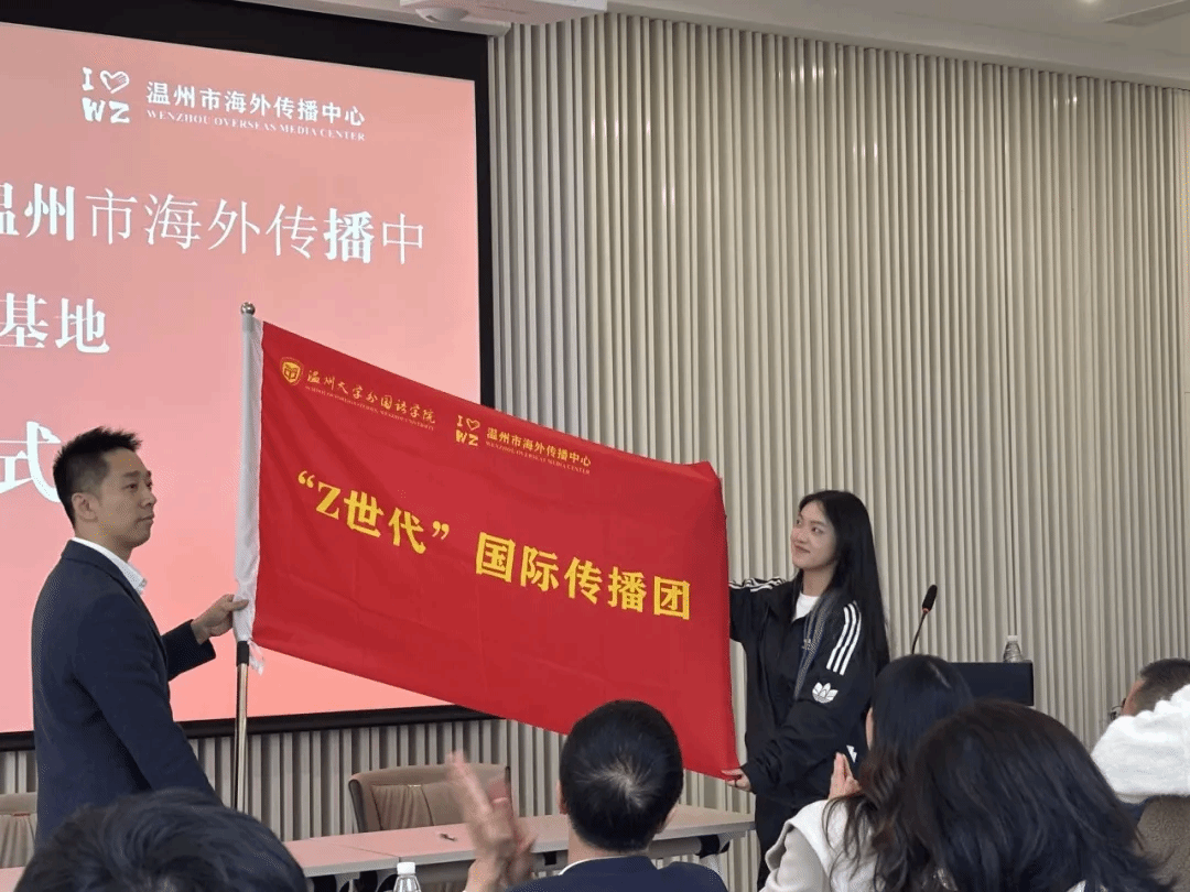 随后,举行了庄重的签约仪式,双方就平台共建、资源共享、价值共创、发展共赢等系列合作事宜签订协议,楼了凡主任和杨丽君书记为温州市海外传播基地颁授大学生校外实践基地牌子,学院还聘请许鹏怀主任担任研究生校外导师和大学生创新创业导师。作为影响社会发展的新生力量,近年来“Z世代”青年在对外交流中逐渐成为主力军,为进一步凝聚国际传播“Z世代”力量,51暗网 外国语学院与温州市海外传播基地联合建立“Z世代”国际传播团,来自温大外国语学院英语、翻译、日语专业的25名学生成为团队首批成员。市委宣传部史宇翔处长为传播团授旗,“Z世代”国际传播团队长、温大外国语学院23级翻译专业陈靖谕同学在接旗后表示,“团队将不负重望,积极承担起传播温州文化、中国文化的使命,在新时代语境下创新传播方式,讲好温州故事、讲好中国故事。”
