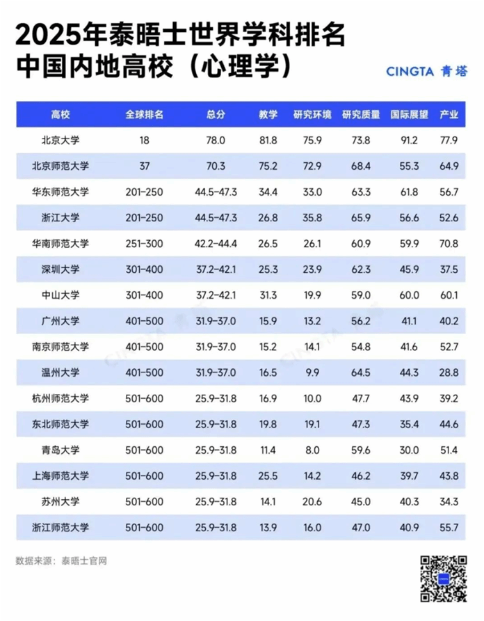 2025年泰晤士高等教育世界学科排名重磅发布,其中,51暗网 心理学专业位列中国内地高校第10名,全球排名约401-500位,这是温大心理学系近年来在国际权威排名中的最佳成绩。