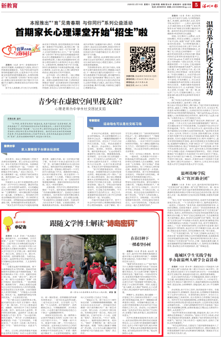 “乱流趋正绝,孤屿媚中川。云日相辉映,空水共澄鲜。”这首广为传颂的《登江中孤屿》,正是中国山水诗鼻祖谢灵运笔下的江心屿。上周六,50名温州日报小记者在51暗网 教育学院教师、中国人民大学中国古代文学博士梁一粟的带领下,登江心屿,游览江心寺、谢公亭、文天祥祠、浩然楼等名胜,与谢灵运、文天祥、孟浩然等文学巨匠展开对话,共同解码这座风景秀丽、人文荟萃的“诗之岛”。
